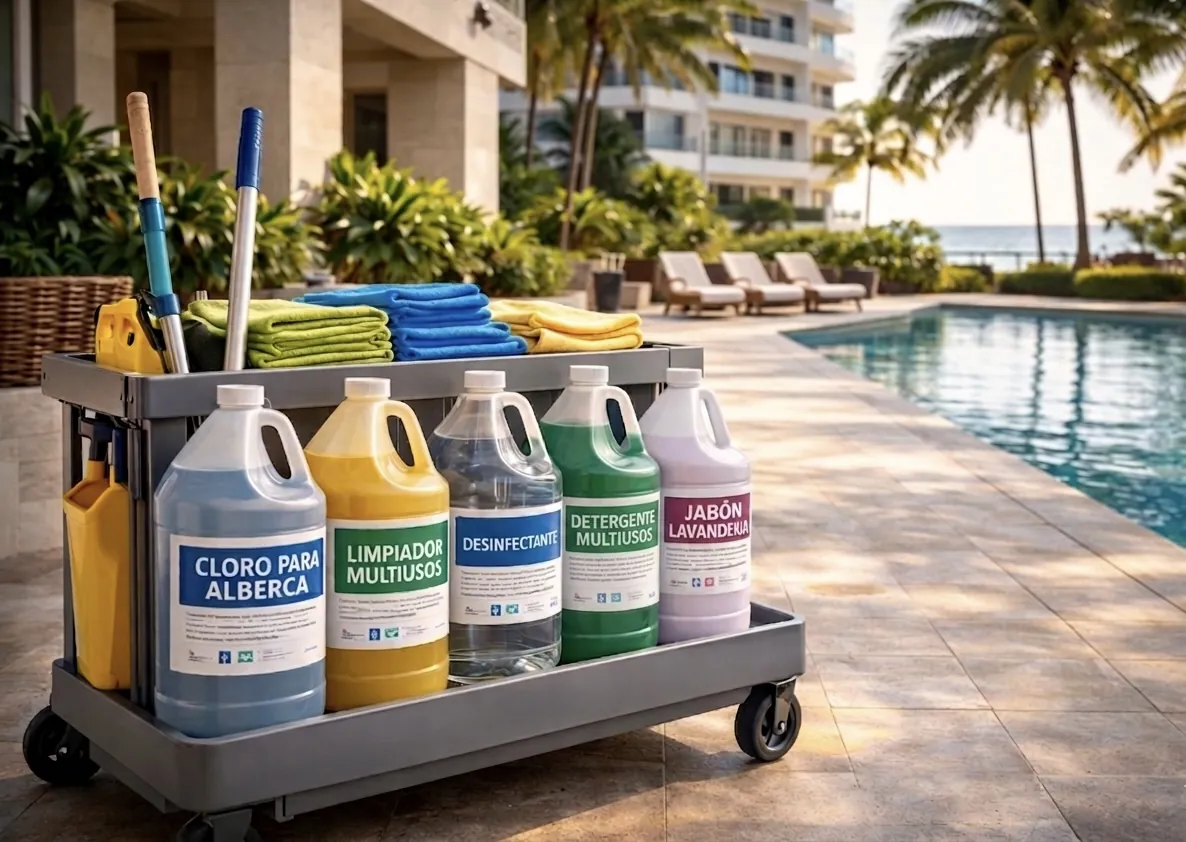 Mantenimiento integral de áreas comunes, albercas y lavandería. Surtimos condominios y desarrollos en Puerto Vallarta y toda la Bahía de Banderas con producto profesional fabricado en México.